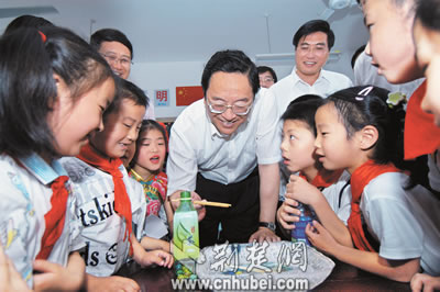 6月1日,武漢市武昌區(qū)為民小學(xué)。兩棵高大的榆樹在小小的院子灑滿了濃陰,一群孩子活蹦亂跳玩著游戲。省委書記俞正聲滿面春風(fēng)地來(lái)到了孩子們中間。