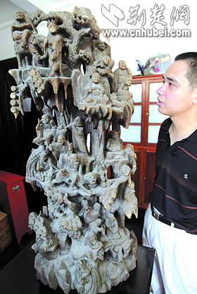 記者看到,這件樟木雕的十八羅漢高約1米,神態(tài)各異,栩栩如生。據(jù)介紹,羅漢是清代雕刻的,屬國家三級(jí)文物。