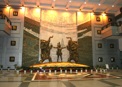 展廳門口聳立著的巨幅雕塑,表現(xiàn)古代一人牽兩象的情景,這也是河南的簡稱“豫”的由來。