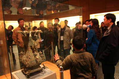 12月5日下午,聚焦中部話崛起采訪團(tuán)一行20多人,興致勃勃地參觀了位于鄭州市北的河南博物院。該院匯集石器、陶器、瓷器、青銅器、金銀器等精美文物2000余件,詳盡的展現(xiàn)了由以彩陶為代表的仰韶文化、春秋戰(zhàn)國青銅器文明以至明清陶瓷藝術(shù)的河南古代文化發(fā)展脈絡(luò)。徜徉在這座文物的大觀園里,記者們對(duì)中華民族悠久燦爛的古代文明發(fā)出由衷的贊嘆。(荊楚網(wǎng)記者 王淳攝)