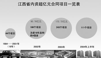 2003年,江西明確提出重點(diǎn)把汽車航空及精密制造業(yè)、特色冶金和金屬制造業(yè)、中藥和生物醫(yī)藥產(chǎn)業(yè)、電子信息和現(xiàn)代家電業(yè)、食品工業(yè)、精細(xì)化工及新型建材業(yè)六大產(chǎn)業(yè)培育發(fā)展成為江西經(jīng)濟(jì)發(fā)展的支柱產(chǎn)業(yè)。到2007年,力爭(zhēng)六大支柱產(chǎn)業(yè)規(guī)模以上企業(yè)的年銷售收入超過(guò)2300億元,年均增長(zhǎng)26%,占全省規(guī)模以上工業(yè)銷售收入的75%左右;占全省生產(chǎn)總值由去年的8.8%提高到15%;形成年銷售收入超100億元的核心企業(yè)8家以上,其中超200億元3家;建設(shè)發(fā)展20個(gè)以上重大特色產(chǎn)業(yè)基地,其中10個(gè)超過(guò)100億元,著力建設(shè)江鈴、昌河、江銅、星火有機(jī)硅、贛南稀土、新鋼、萍鋼、萍礦等特色工業(yè)小區(qū)。