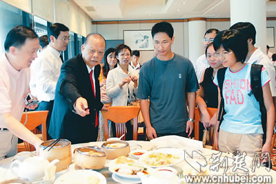 8月17日,曾憲梓與本報(bào)受助學(xué)子赴港參觀團(tuán)座談。中午12點(diǎn),曾憲梓老人興致勃勃地對(duì)同學(xué)們說(shuō):“孩子們,走,中午曾爺爺請(qǐng)你們吃茶點(diǎn)!”