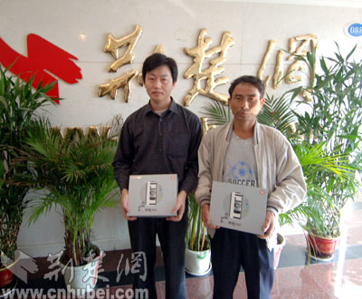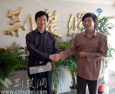 荊楚網(wǎng)24日訊 記者艾丹 潘頔 報道:23日抽出的“讀報紙、發(fā)短信、中手機(jī)”活動的兩位幸運(yùn)獲獎?wù),武漢的李先生和谷城的孟先生,今天下午來到荊楚網(wǎng)領(lǐng)獎,荊楚網(wǎng)總編輯閻思甜親自為他們頒獎。