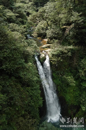參觀完兩處紅色旅游景點(diǎn)之后,記者們順道觀光了龍?zhí)讹L(fēng)景區(qū)。龍?zhí)段挥诖钠何鞅逼吖铮墙陙黹_發(fā)的以自然與人文景觀相結(jié)合的旅游風(fēng)景區(qū)。據(jù)介紹,當(dāng)?shù)氐奈迳窈邮驱執(zhí)丁拔逄妒似佟钡脑慈。溪水沖擊小井峽谷后,陡然跌落絕壁之下,又連續(xù)飛下四級斷崖,形成梯狀的五個氣勢磅礴的瀑布和深潭,這就是碧玉、金鎖、珍珠、飛鳳、玉女等五潭五瀑。細(xì)察五潭,碧水泱泱,樹影幢幢,崖壁如刀削斧鑿,崖腳怪石,汀芷競秀,綠蔭覆蓋四周。仰觀五瀑,潭潭無俗水,瀑瀑似神女。