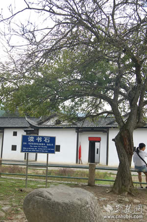 舊居坐落在大井村中央,因墻壁為白色,慣稱它為"白屋"。這棟房子共有44間,五個天井,面積近千平方米。毛澤東率領(lǐng)工農(nóng)紅軍首次到達(dá)大井時就住在這里,此后便成為毛澤東在大井的住地。1929年1月底,這棟房子被敵人燒毀,僅剩下一堵殘墻、屋后的兩棵樹和房前草坪上的一塊大石頭。1960年,當(dāng)?shù)卣丛残迯?fù),將殘墻嵌入新墻之中作為紀(jì)念。屋前的有塊大石頭因毛澤東時常坐在上面看書讀報、批閱文件,被人稱為“讀書石”。