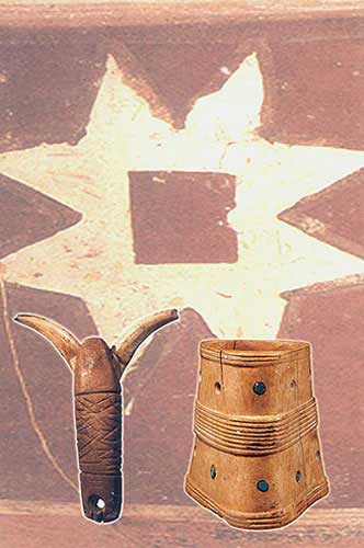 鑲嵌綠松石骨雕筒:裝飾品(右,高7.7匣米)