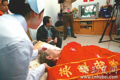聶海勝家二樓的小客廳里,兩面墻壁上都掛著聶海勝身穿航天服的大幅照片。因病臥床一年之久的聶海勝的母親張金秀老人,此時(shí)被鮮花簇?fù),身上的被子上斜披著一條“英雄母親”的紅色綬帶,煞是醒目。