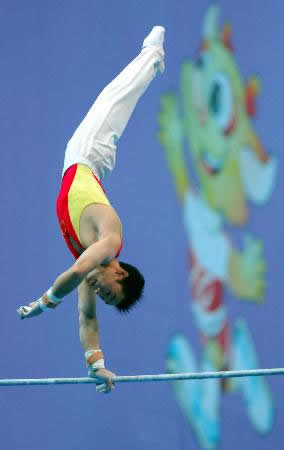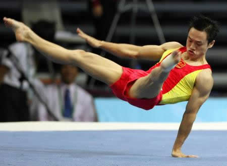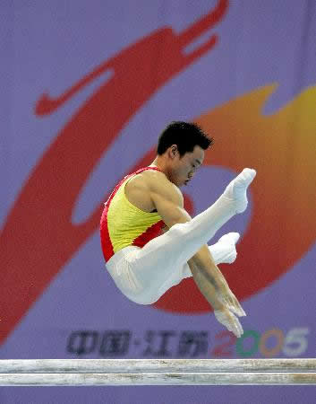 10月13日,湖北選手楊威在自由體操比賽中。當(dāng)晚,十運會體操男子全能決賽在南京奧體中心舉行。楊威最終奪得銀牌。(新華網(wǎng))