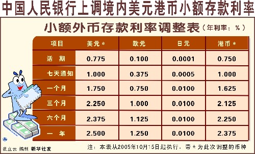中國人民銀行決定自2005年10月15日起上調(diào)境內(nèi)商業(yè)銀行美元、港幣小額外幣存款利率上限。其中,一年期美元、港幣存款利率上限均提高0.5個(gè)百分點(diǎn),調(diào)整后利率上限分別為2.5%和2.375%(詳見附表)。