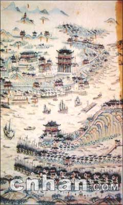此圖藏于大連市圖書館,手繪彩圖。未標(biāo)明作者姓名和成圖時(shí)間,圖中標(biāo)注了武昌、漢口“龍王廟”等。筆者鑒定此圖為清代中期作品,根據(jù)是圖中有“龍王廟”,而龍王齋建于乾隆四年(1739年),故此圖當(dāng)于1739年以后所繪。但圖中沒有出現(xiàn)漢口城堡,而漢口城堡建于1864年,同時(shí)圖中只繪有木帆船,而未出現(xiàn)現(xiàn)近代輪船。武漢江面出現(xiàn)航運(yùn)和輪船是1862年以后?芍,此圖當(dāng)成于1862年前?纱篌w界定此圖繪于1739年至1862年之間。
