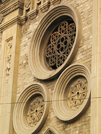 ③窗戶“合十”、“天圓地方”:古德寺窗戶的設(shè)計(jì)可謂別具一格。寶殿墻上可見三個(gè)一組的圓窗,分別為哥特風(fēng)格和中國的八卦圖;圓窗下是形如竹筍的花窗,象征著佛祖雙手合十的姿態(tài);回廊里的窗戶則上圓下方,取“天圓地方”之意。