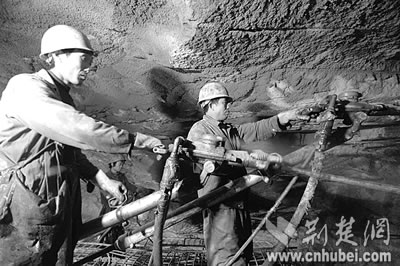 穿著雨衣的工人們手持風(fēng)槍,正在腳手架上下打爆破眼,山體里的水嘩啦啦直往下噴,然后順著挖好的水槽排向洞外,最多時一天要排3000立方米。“這水算小的!”也許是察覺出我們眼神里的擔(dān)心,包秀峰輕松笑笑,仿佛一切都在他們掌控中。他甚至調(diào)侃說,“瞧,我們都穿皮鞋上班,施工環(huán)境沒你們想象中那么艱難!