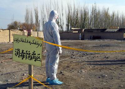 在通往鎮(zhèn)政府的路口,烏魯木齊縣公安局的民警正在值班,對(duì)過(guò)往車輛進(jìn)行檢查和消毒。一位名叫馮玉虎的警官告訴記者,11日這里出現(xiàn)疑似禽流感疫情后,全鎮(zhèn)共設(shè)有23個(gè)卡子,24小時(shí)有人值班。