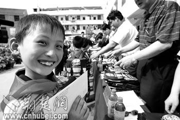 我省2005年春季“希望工程助學(xué)進(jìn)城計(jì)劃———金龍魚(yú)農(nóng)民工子女助學(xué)金”本月起開(kāi)始陸續(xù)發(fā)放,1000余名在漢打工的農(nóng)民工子女可獲得每學(xué)期300元的資助款。預(yù)計(jì)五年內(nèi),我省將有4000人次的農(nóng)民工子女獲此項(xiàng)資助。圖為武漢市東升學(xué)校二年級(jí)的李灣小朋友領(lǐng)到助學(xué)金后高興地笑了。