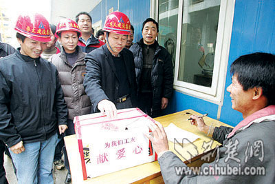 工友們悄悄謀劃開(kāi)了。昨日上午,在施工現(xiàn)場(chǎng),大家你100、我50地將錢(qián)投進(jìn)捐款箱。一個(gè)多小時(shí)內(nèi),共捐款3460元。