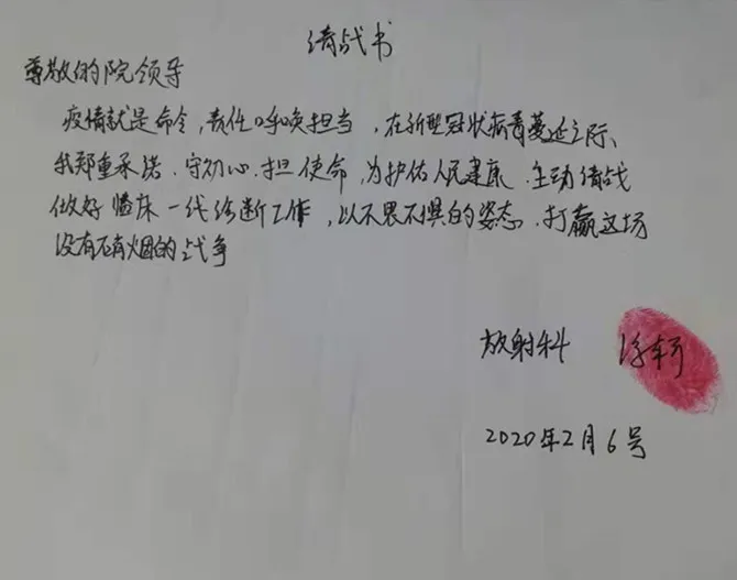 在疫情最緊急的時候,全院200多位醫(yī)護人員主動請纓加入“戰(zhàn)斗”,一筆筆簽名,一個個紅手印,彰顯的是責(zé)任,是面對疫情時絕不退縮的堅強擔(dān)當(dāng)!