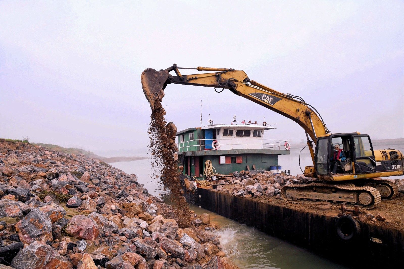 陸水河四清垸大堤全長(zhǎng)450米,多年來(lái)的洪水侵襲致使河床下沉,堤岸崩裂。對(duì)此,赤壁市制訂了堤岸拋石護(hù)腳整治規(guī)劃。隨著疫情逐漸好轉(zhuǎn),赤壁市于3月18日啟動(dòng)工程維修計(jì)劃,投入大量人力物力。隨著挖掘機(jī)鐵臂的揮舞,一塊塊巨石墜落在河岸,為大堤的防洪能力再加一道保險(xiǎn)。