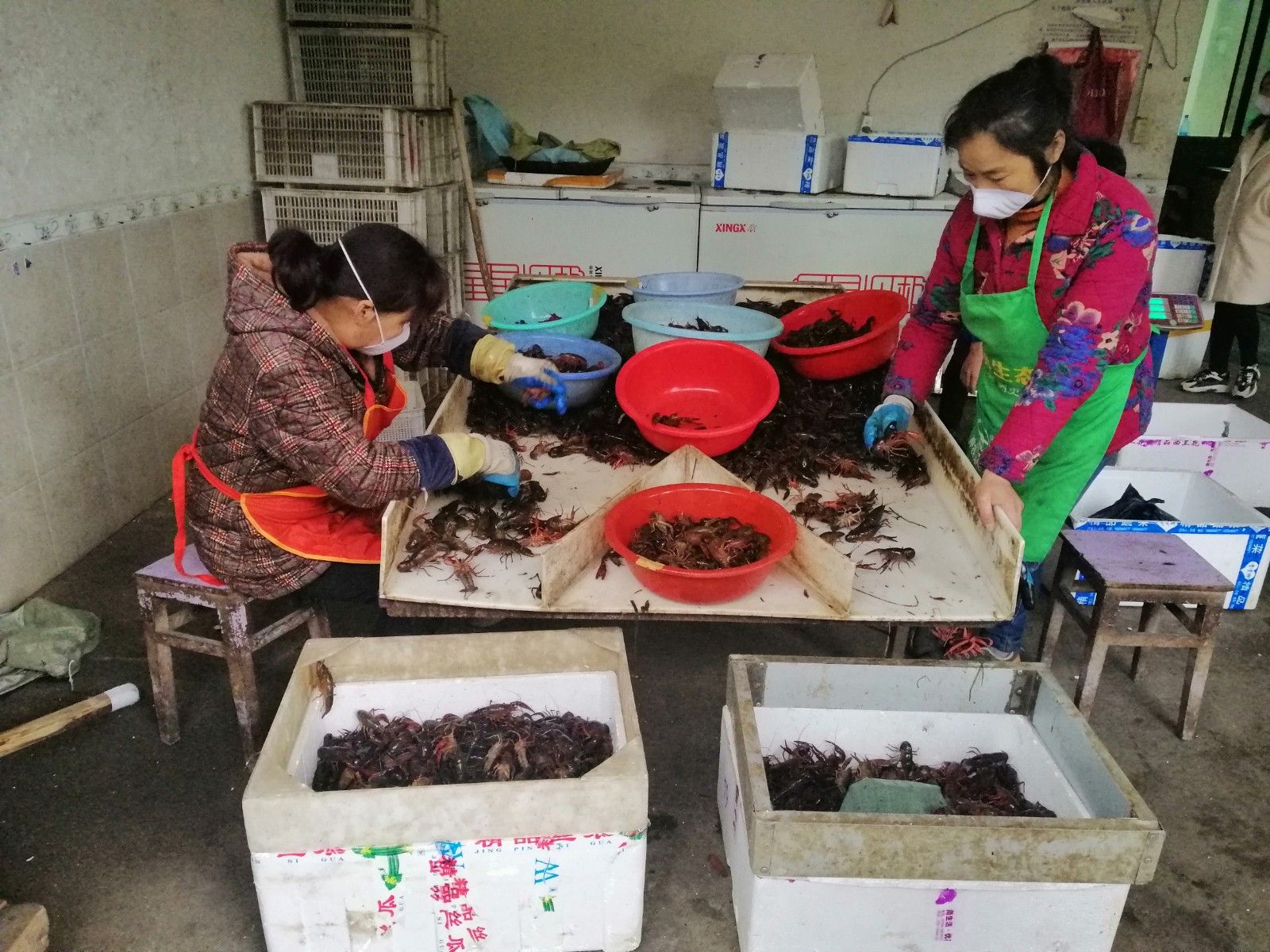 在官塘驛鎮(zhèn)泉口村神泉湖種養(yǎng)殖專業(yè)合作社,負(fù)責(zé)人童聰正在忙著將收購來的小龍蝦進(jìn)行等級分揀打包,準(zhǔn)備發(fā)往全國各地。該合作社現(xiàn)在每天小龍蝦成交量3000斤左右,高峰期保持在1.5萬斤,主要銷往江浙滬粵。