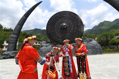11日,通城縣大坪鄉(xiāng)內(nèi)沖瑤族村瑤望千年廣場(chǎng),游客身著鮮艷服裝,開(kāi)始錄制抖音。