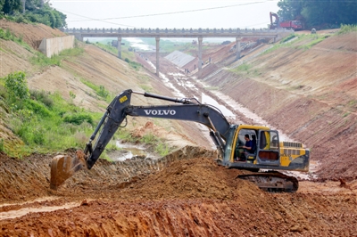 5月22日,在斧頭湖流域兩湖連通工程施工現(xiàn)場(chǎng),工程翻斗車、推土機(jī)、壓路機(jī)往來穿梭,對(duì)下穿G351國(guó)道箱涵周邊進(jìn)行土石分層填筑、分層碾壓。