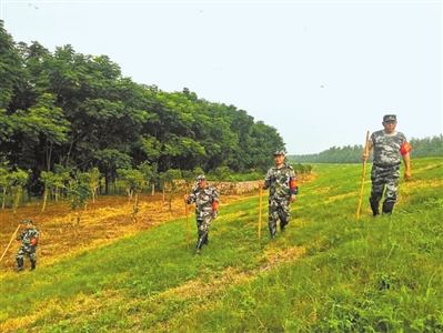 “這個(gè)插上紅旗做標(biāo)志的地方是地質(zhì)鉆口,雖已封口,但每次巡堤一定要來檢查,看周圍是否有異常……”這是朱天志給新上堤的“90后”防汛突擊隊(duì)員唐文講巡堤技巧和相關(guān)要領(lǐng)。