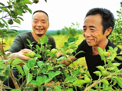 9月10日,崇陽縣石城鎮(zhèn)漢興村村民楊四雄(右)在油茶基地查看油茶長(zhǎng)勢(shì)。