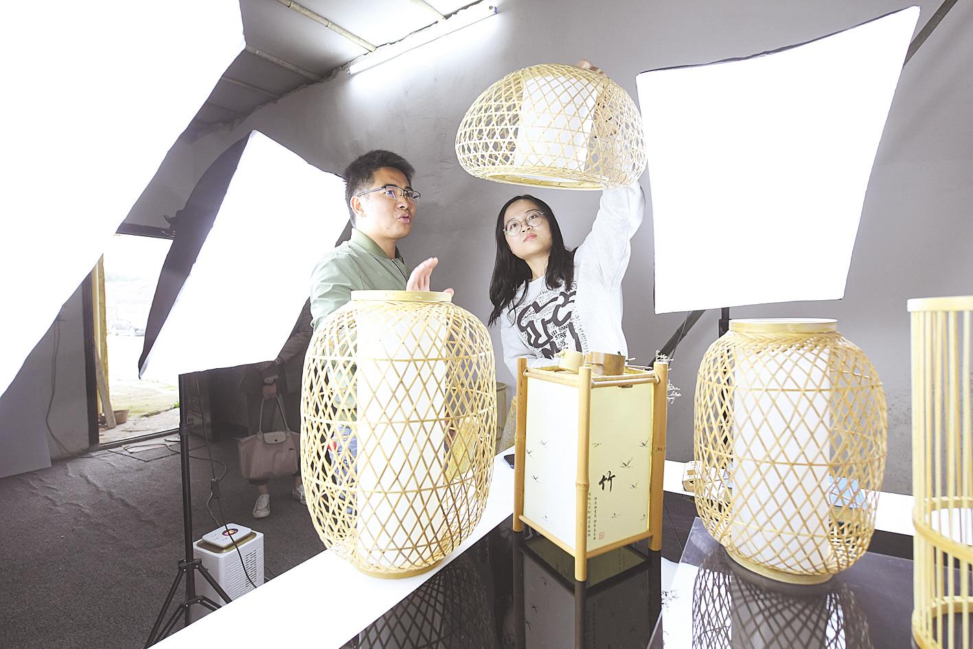 10月14日,咸寧市咸安區(qū)大幕鄉(xiāng)雙垅村竹雕藝人在攝影棚向客人介紹竹制家居用品和工藝品。去年5月,當(dāng)?shù)卮髮W(xué)畢業(yè)生賀慈回鄉(xiāng)創(chuàng)業(yè),成立藝竹情工藝品公司,聘請(qǐng)民間藝人手工制作工藝品,通過電商銷售,今年前三季度銷售額500多萬元。