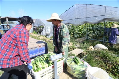 12日,咸安區(qū)綠佳綠色蔬菜專業(yè)合作社蔬菜基地,菜農(nóng)將新鮮采摘的黃瓜稱重運(yùn)往市場(chǎng)。