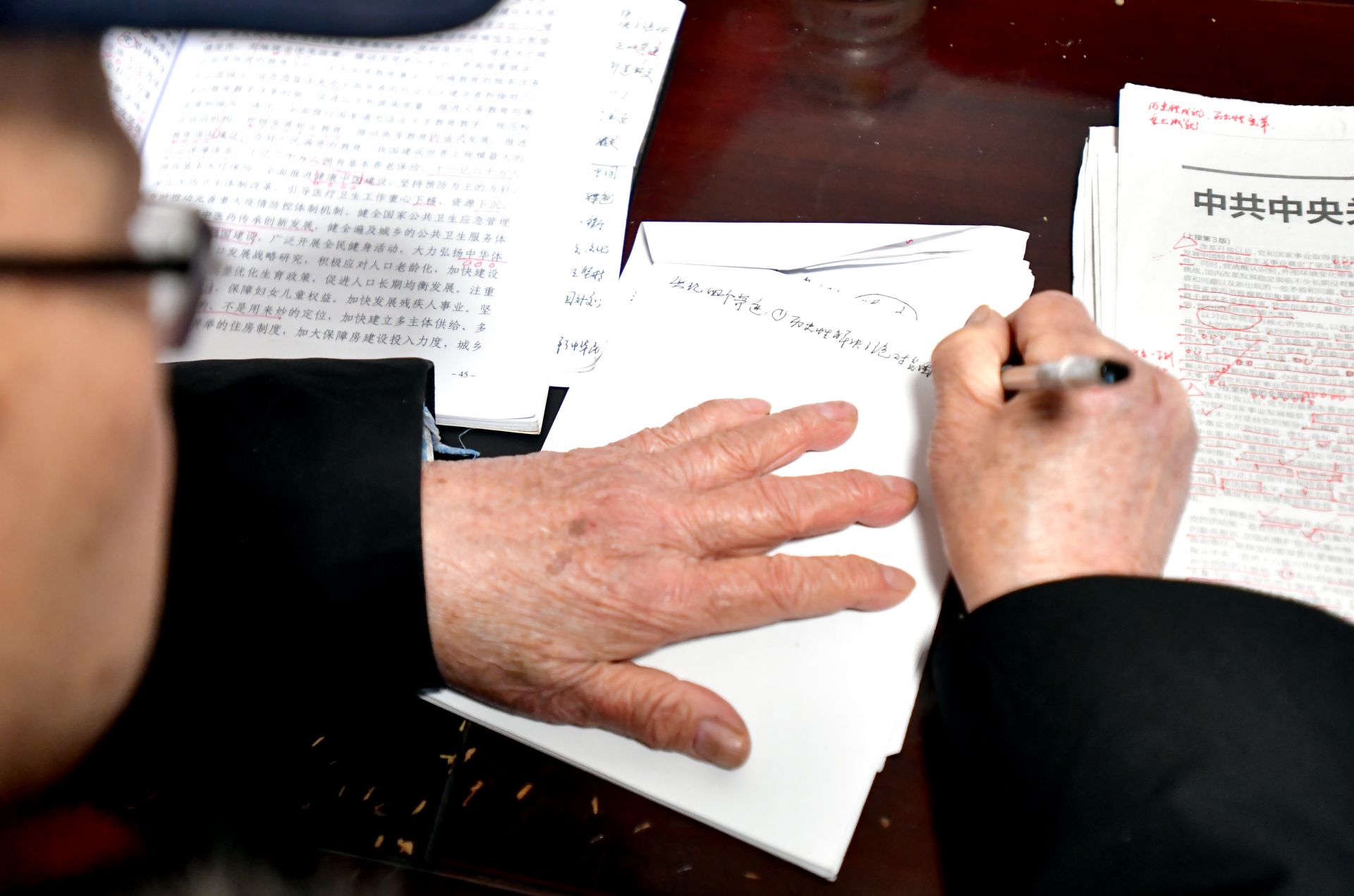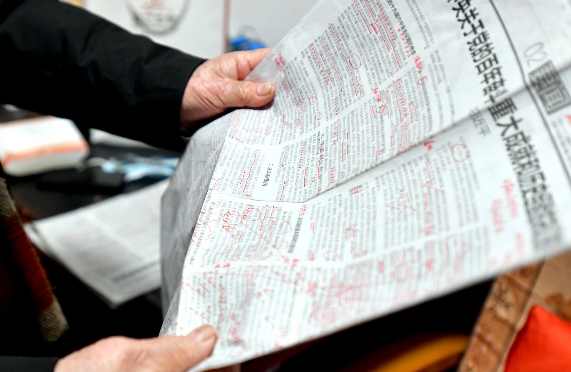 他的書(shū)桌上堆滿了厚厚的書(shū)籍,筆筒插著一面小國(guó)旗,面前攤開(kāi)的報(bào)紙上,紅色的標(biāo)注分外醒目。老人正一筆一劃、不疾不徐地做著筆記。