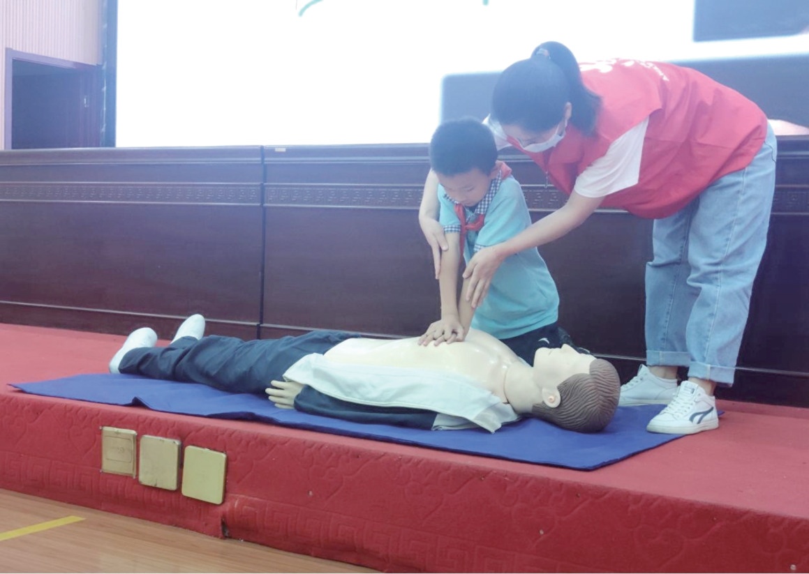 活動(dòng)現(xiàn)場,杜成芬還為大家演示了心肺復(fù)蘇術(shù)和海姆立克急救法,學(xué)生們?cè)诶蠋煹闹笇?dǎo)下認(rèn)真學(xué)習(xí)演練。
