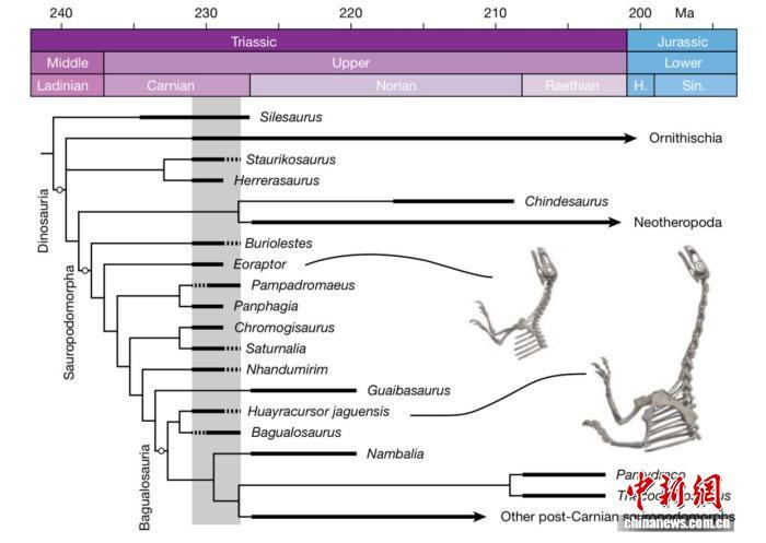 該論文介紹,晚三疊世(約2.37億-2.01億年前)的生態(tài)系統(tǒng)發(fā)生了急劇變化,導(dǎo)致恐龍、哺乳動物的早期近親以及包括鱷魚在內(nèi)的動物種群崛起和分化??铸堅缙谘莼脑S多證據(jù)都發(fā)現(xiàn)于南美,大部分關(guān)鍵發(fā)現(xiàn)局限于阿根廷和巴西的兩個盆地地區(qū)。