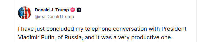 在16日稍晚時(shí),美國(guó)總統(tǒng)特朗普在其個(gè)人社交媒體平臺(tái)上發(fā)布了同俄羅斯總統(tǒng)普京當(dāng)天通話的內(nèi)容,并積極表態(tài)稱,此次通話非常富有成效。在特朗普相關(guān)聲明發(fā)出后不久,俄羅斯總統(tǒng)特使德米特里耶夫也發(fā)聲表示,兩國(guó)總統(tǒng)的通話“積極且富有成效”,雙方明確了下一步的行動(dòng)方案。