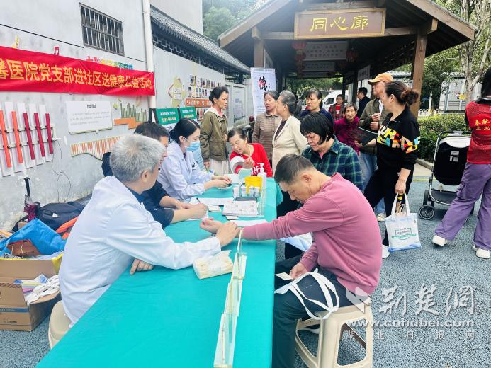 在另一角落,醫(yī)護人員耐心講解健康知識,社??ㄞk理區(qū)的漢口銀行工作人員忙個不停,為居民免費辦理社??ㄉ墭I(yè)務(wù)。