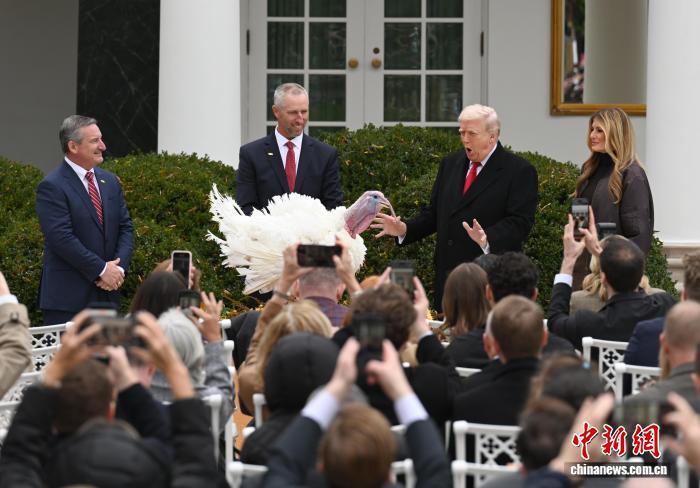 當(dāng)?shù)貢r間11月25日,華盛頓,美國總統(tǒng)特朗普在白宮赦免2025年感恩節(jié)幸運火雞“咯咯”(Gobble)。中新社記者 陳孟統(tǒng) 攝