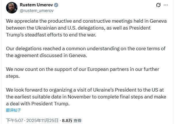 烏克蘭國(guó)家安全與國(guó)防委員會(huì)秘書(shū)烏梅羅夫則于同日在社交媒體上公開(kāi)表態(tài)稱(chēng),美烏雙方代表團(tuán)已就在日內(nèi)瓦討論的協(xié)議的核心內(nèi)容上,達(dá)成一致。