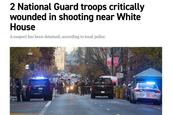 據(jù)警方官員稱(chēng),國(guó)民警衛(wèi)隊(duì)成員當(dāng)時(shí)正在執(zhí)行巡邏,突然遭到槍擊。警方還稱(chēng),現(xiàn)場(chǎng)已得到控制,涉嫌開(kāi)槍者已被“制服”并被拘捕,但同時(shí)建議民眾避開(kāi)該區(qū)域。