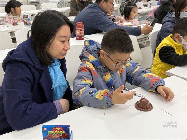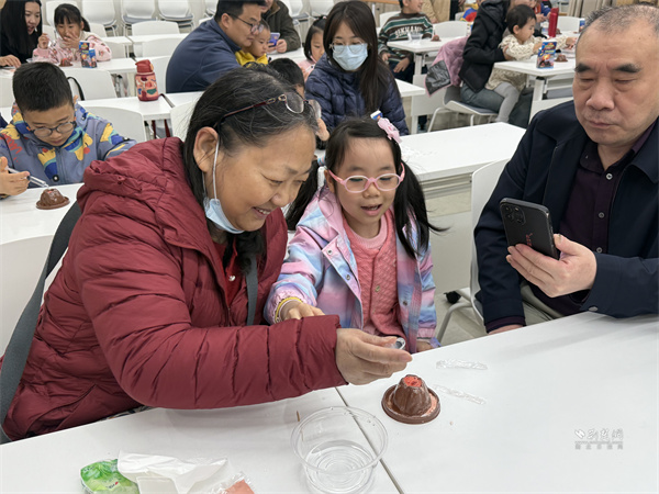 為讓抽象原理更直觀,活動(dòng)設(shè)置模擬火山噴發(fā)實(shí)驗(yàn)環(huán)節(jié)。現(xiàn)場(chǎng)備好黏土火山模型、小蘇打、白醋等物料,容東林一邊操作一邊講解:向“巖漿腔”倒入小蘇打并加紅色素,再注入白醋,紅色“巖漿”瞬間噴涌而出,引得居民驚嘆、孩子們目不轉(zhuǎn)睛。他引導(dǎo)大家觀察全過程,深入淺出解釋酸堿反應(yīng)原理及火山灰對(duì)生態(tài)環(huán)境的影響,還邀請(qǐng)孩子們近距離體驗(yàn),激發(fā)科學(xué)探索興趣。