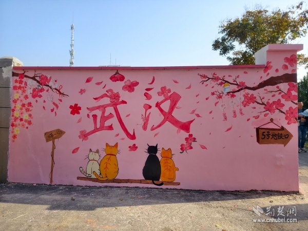 次日,創(chuàng)作進(jìn)入精修階段。志愿者們細(xì)致調(diào)整“武漢”字樣的色彩飽和度,用粉白顏料層層暈染出飛揚(yáng)的櫻花花瓣。四只形態(tài)各異的貓咪相依蹲坐,靈動(dòng)可愛;特意添加的“5號地鐵口”指引牌等實(shí)用元素,更讓作品兼具藝術(shù)性與功能性。創(chuàng)作過程中,不斷有居民和游客駐足觀賞,主動(dòng)詢問設(shè)計(jì)理念?!拔覀兿胪ㄟ^櫻花、貓咪等元素,展現(xiàn)武漢的浪漫與煙火氣?!敝驹刚咭贿呎{(diào)色一邊向圍觀群眾講解。