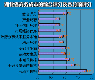 投資者對影響我省商務(wù)成本的十大因素的評價都較均衡,各項評分介于67.8-77之間,綜合評分70.51,正好位于基本滿意(60)與滿意(80)區(qū)間的中位。較去年同類調(diào)查數(shù)據(jù)相比,提高3.5分。 ……………………………………………………………………