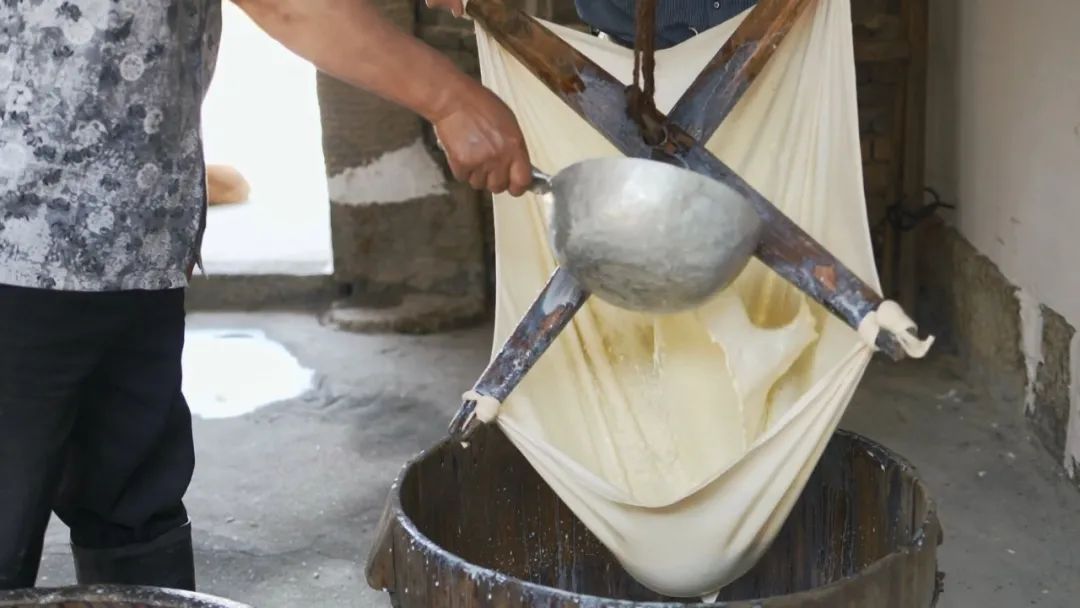 過濾后的生豆?jié){在廚房里燒煮直到沸騰。燒開的豆?jié){裝缸后再被抬到堂屋,加入熟石膏,靜置一段時間就能生成豆腐腦。最后就是上架壓制豆腐干子了,這些其實都就是傳統(tǒng)豆腐的做法。