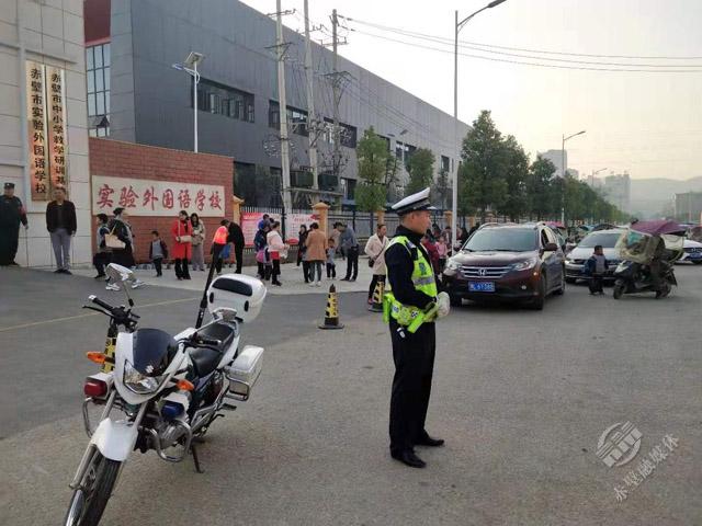 11月22日12:15分,赤壁市第一初級中學(xué)校門口,市交警大隊正在開展“交警護學(xué)崗”活動。民警在學(xué)生上學(xué)放學(xué)時段進行交通疏導(dǎo),指揮車輛減速讓行,確保學(xué)生安全往返。