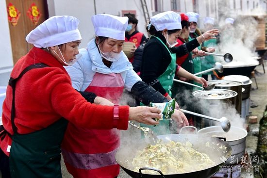 中午12時(shí),開(kāi)席上菜。不少村民忙著籌備年豬宴,將成年豬宰殺后制作成各類(lèi)美食。不多時(shí),一道道香氣十足的菜肴——粉蒸肉、農(nóng)家臘肉等十多個(gè)菜陸續(xù)端上餐桌。大家圍聚在一起共品美食,開(kāi)懷暢飲,提前感受那份濃濃的年味兒。